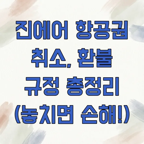 본 콘텐츠는 진에어 항공권 취소 및 환불 규정에 대한 일반적인 정보를 제공하며, 실제 규정은 항공권 종류, 구매 시점, 프로모션 등에 따라 달라질 수 있습니다. 최신 및 정확한 정보는 반드시 진에어 공식 홈페이지 또는 고객센터를 통해 확인하시기 바랍니다. 본 정보로 인해 발생하는 직간접적인 손해에 대해 어떠한 책임도 지지 않습니다.